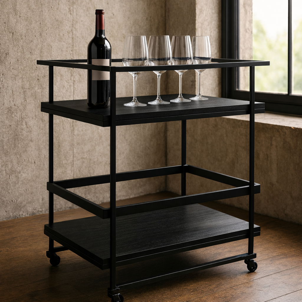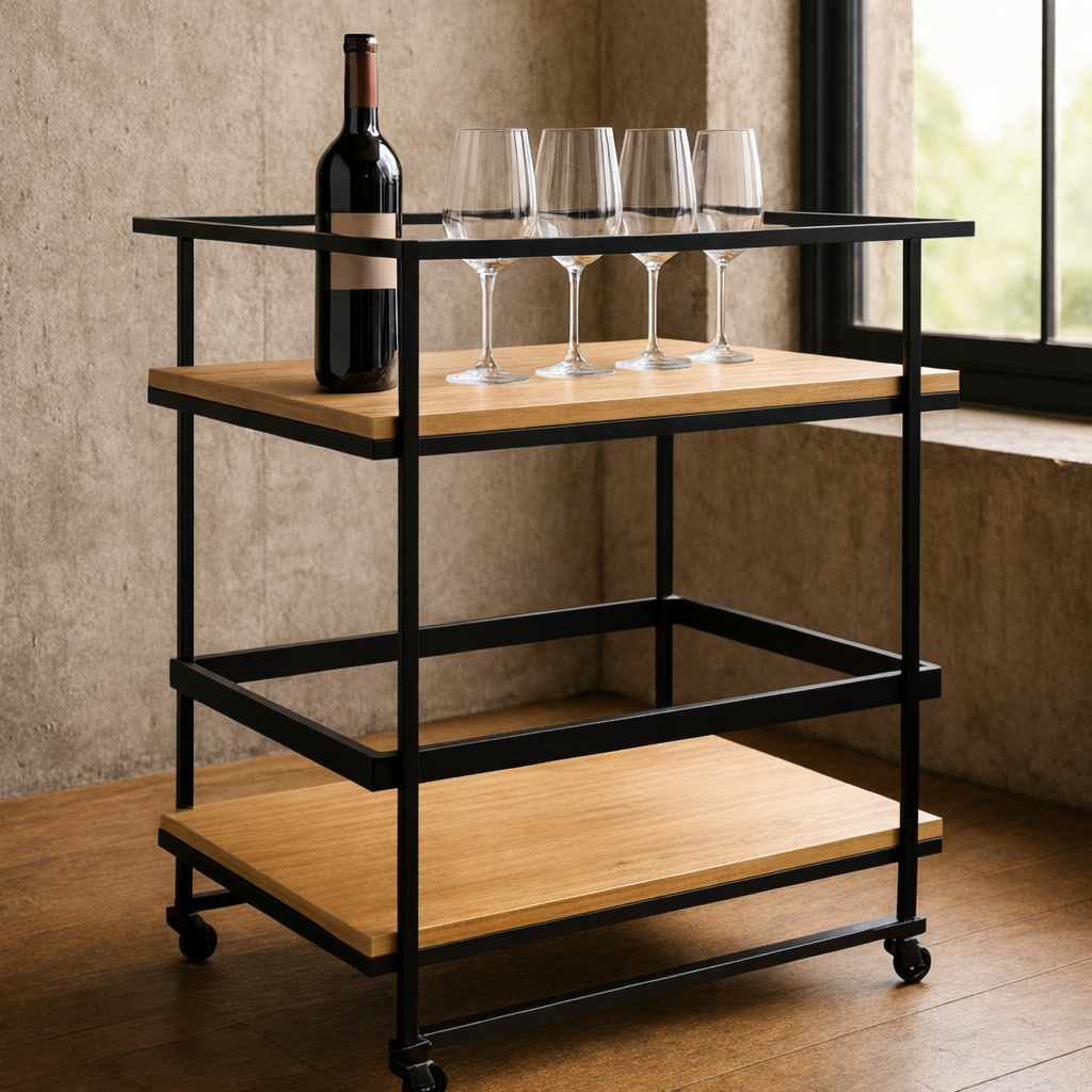 Este carro bar combina la calidez de la madera con la solidez de su estructura metálica negra electropintada, logrando un diseño moderno con un sutil toque industrial.