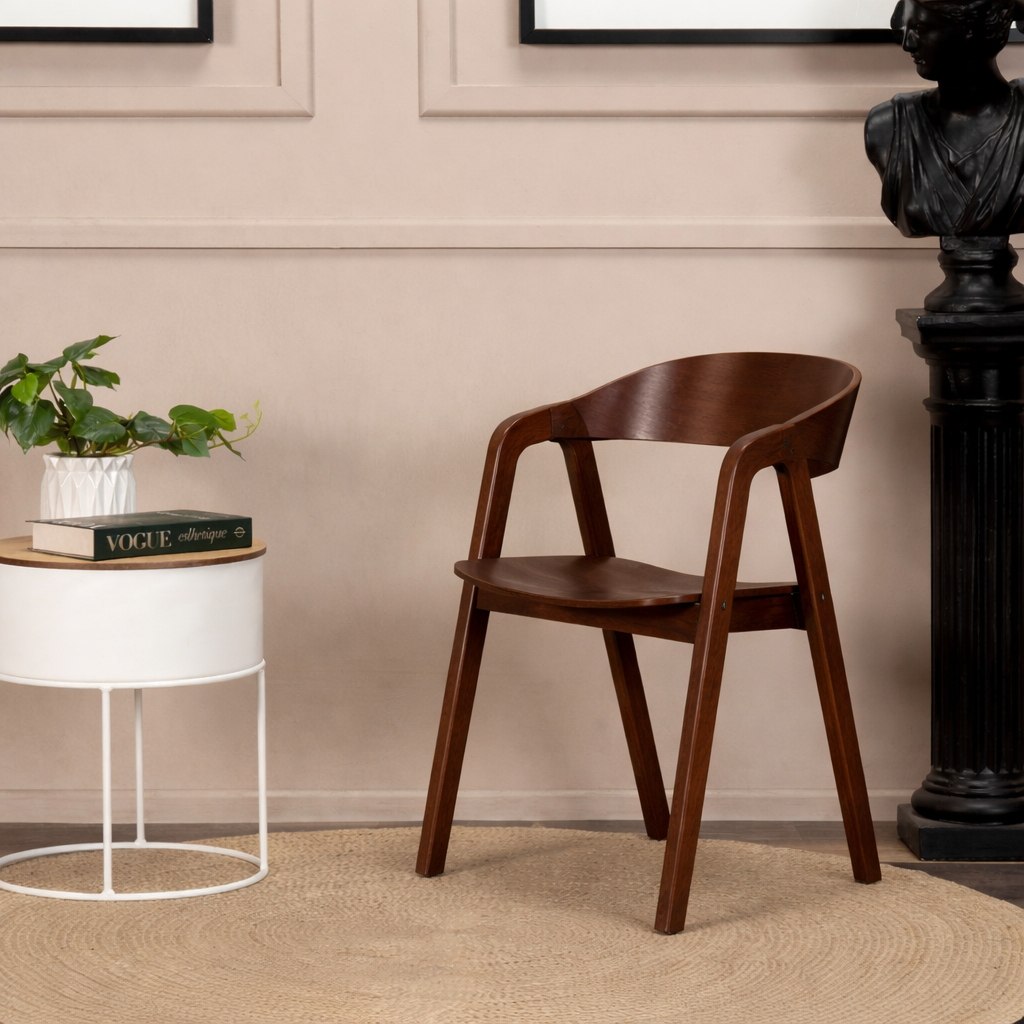 Su estructura de madera en tono Nogal aporta calidez y carácter, mientras que su silueta ligera mantiene una presencia refinada y versátil. Un diseño que equilibra robustez y ligereza, ideal para espacios que buscan sofisticación sin esfuerzo.